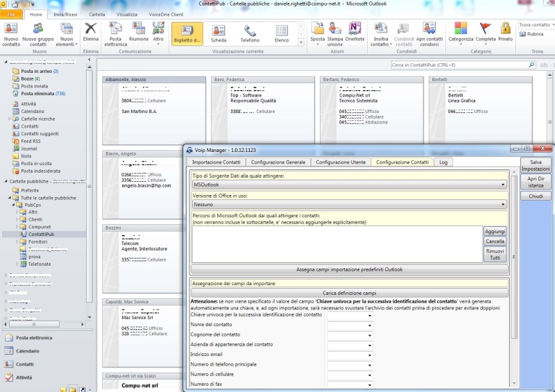 Voip Manager è l'applicazione installabile su tutti i sistemi Windows capace di importare e mantenere sincronizzati i contatti all'interno di VoiceOne, prelevandoli da una fonte dati esterna. Voip Manager permette di estrarre i contatti ed i relativi numeri di telefono da un file CSV, dal collegamente con Microsoft Outlook o Microsoft Exchange o da un database SQL. L'esecuzione dell'importazione può essere configurata e posticipata o schedulata nel tempo in modo da mantenere i contatti della ruibrica sempre sincronizzati.